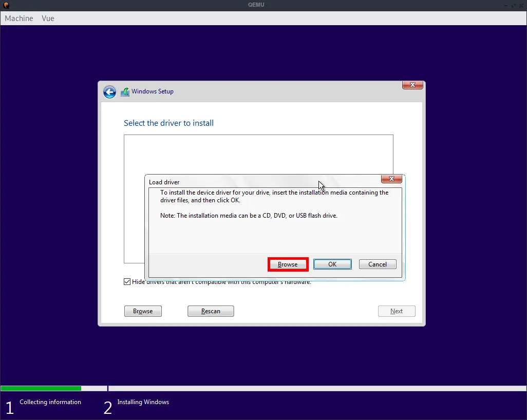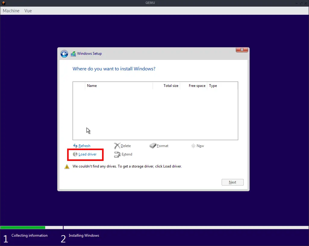 [user@host ~]$ qemu-system-x86_64 -smp 2 -net nic,model=e1000,macaddr=52:54:00:12:34:56 -net user,id=mynet0,net=192.168.76.0/24,dhcpstart=192.168.76.9,hostfwd=tcp::5555-:3389 -cpu host -vga cirrus -m 4096 -cdrom /data/en_windows_10_enterprise_ltsc_2019_x64_dvd_74865958.iso -enable-kvm -boot order=d -drive file=/data/WIN_10_LTSB_HDD01,index=0,media=disk,if=virtio,format=raw -drive file=/tmp/virtio-win.iso,media=cdrom,index=3